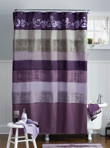 A beautiful combination of pleats and embroidery create this delightful shower curtain with a scroll detailed top border. A wonderful bathroom centerpiece in shades of purples & taupe. Polyester. Machine wash. Imported. 70"W x 72"L. (Hooks not included, sold separately - see item 93674).You will not be disappointed with