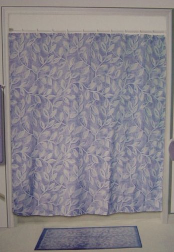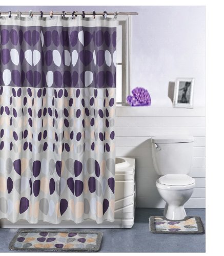 Give your bathroom a new look with the Blue Denim 15 Pcs Bath Accessories Set. The set includes an attractive shower curtain, 12 pcs fabric covered rings, coordinating bath rug, and contour mat.You will not be disappointed with Grey w/ Blue & Purple Print 15 Peice Bathroom Set: Shower Curtain, Rug, Contour Mat, 12 Fabric Covered Rings