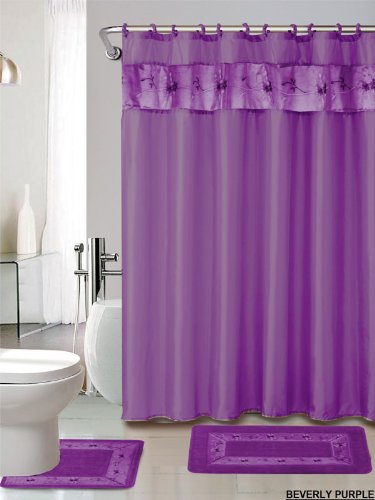 "Buy 4 Piece Luxury Embroidered Bath Rug Set/ 3 Piece Purple Bathroom Rugs with Fabric Shower Curtain and Matching Rings" Overview